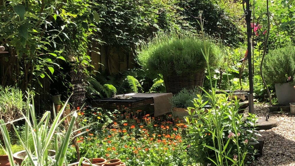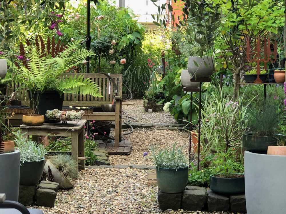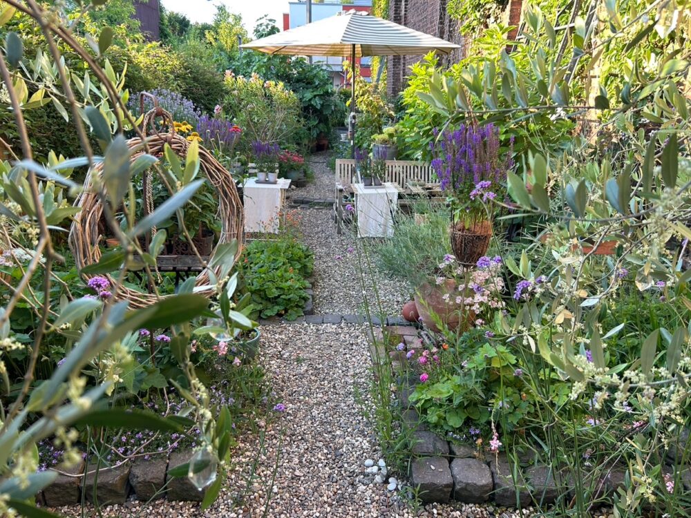 Eigentlich ist es gar kein Garten. Sondern eine verwunschene Struktur aus Blumen, Blättern und Zweigen, die sich um das Loft in den Mauern des Industriedenkmals der alten Baumwollspinnerei legt. Kieswege, mit Steinen eingefasste Beete, ausrangierte Bogenfenster bilden den Rahmen, Tische mit Funkien und handgefertigten Kränzen eine zweite Ebene für 50 Shades of Green.