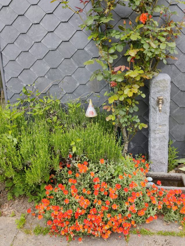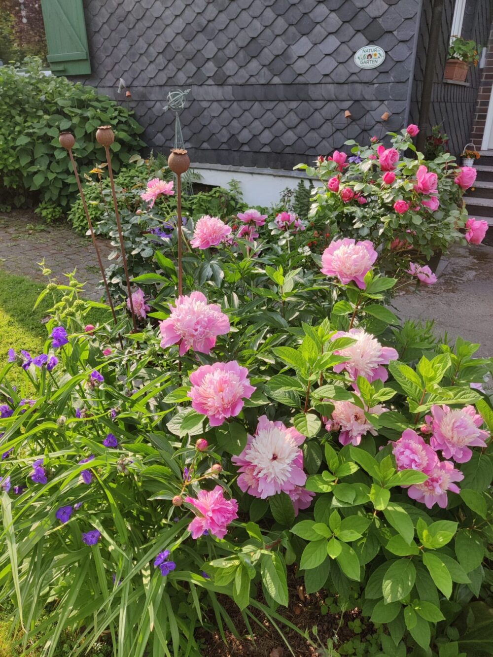 Interessante Blickachsen lassen artenreiche Staudenrabatten, ca. 25 verschiedene Rosen, Hortensien und Obstbaumwiese, Küchengarten mit Treibhaus, Sandarium und gemütliche Sitzplätze entdecken. Eingerahmt wird das Grundstück von alten Gehölzen und zunehmender Betonung für Wildbienen und Insekten.