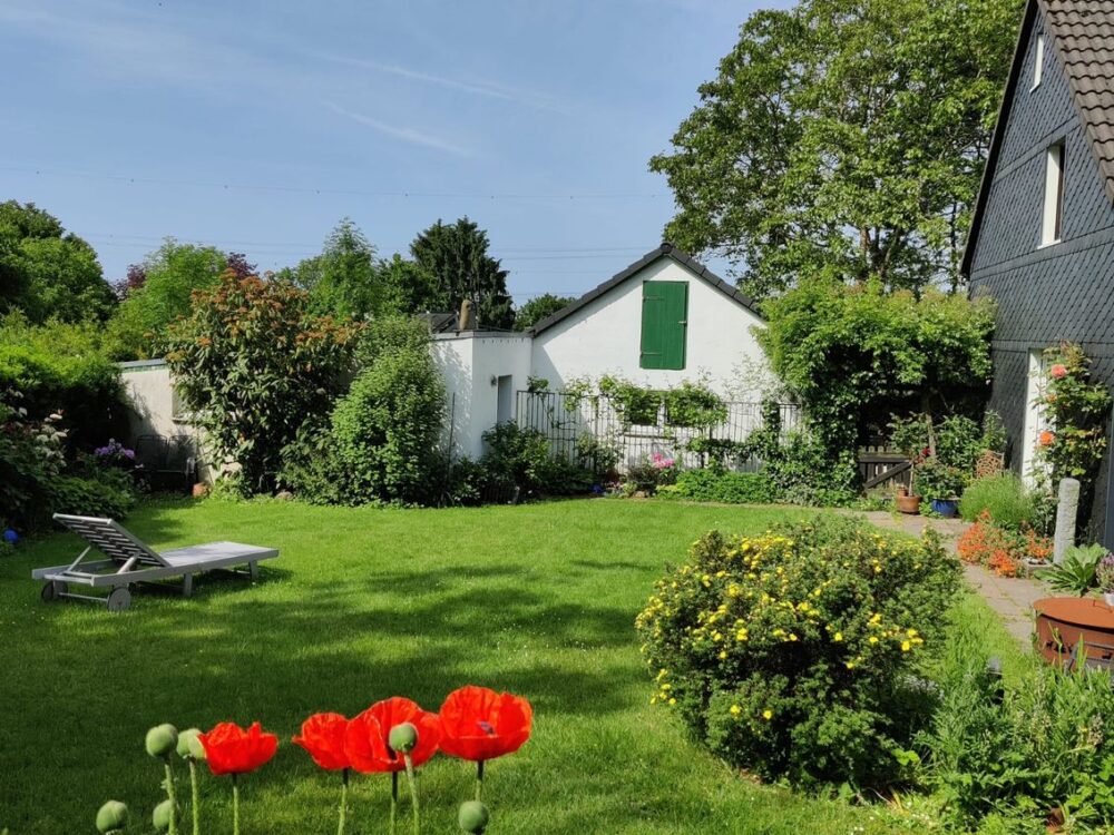 Das naturnahe 2.500 m² große Grundstück mit dem bergischen Schieferhaus hat fünf Gartenräume.