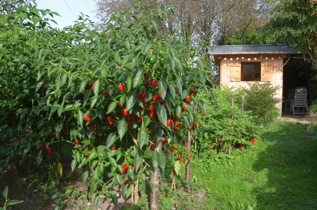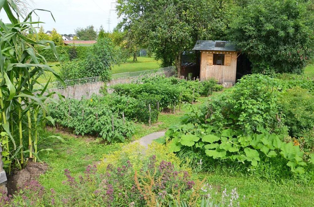Südamerikanischer Garten mit vielen peruanischen Chili-Sorten, Mais, Kartoffeln, Kürbis, Inka-Gurke, Physalis, Gewürztagetes und anderen Pflanzen aus Peru. Naturnahe Gestaltung mit unbefestigten Wegen, Blühstreifen, Obstbäumen, Brombeer-Spalier, Kräuter-Pyramide, Totholzhaufen, Trockenmauern aus Bauschutt. „Off Grid“-Garten ohne Strom- und Wasseranschluss, mit Regenwasser-Tanks, Kompost-Toilette und selbst konstruiertem Gartenhaus.