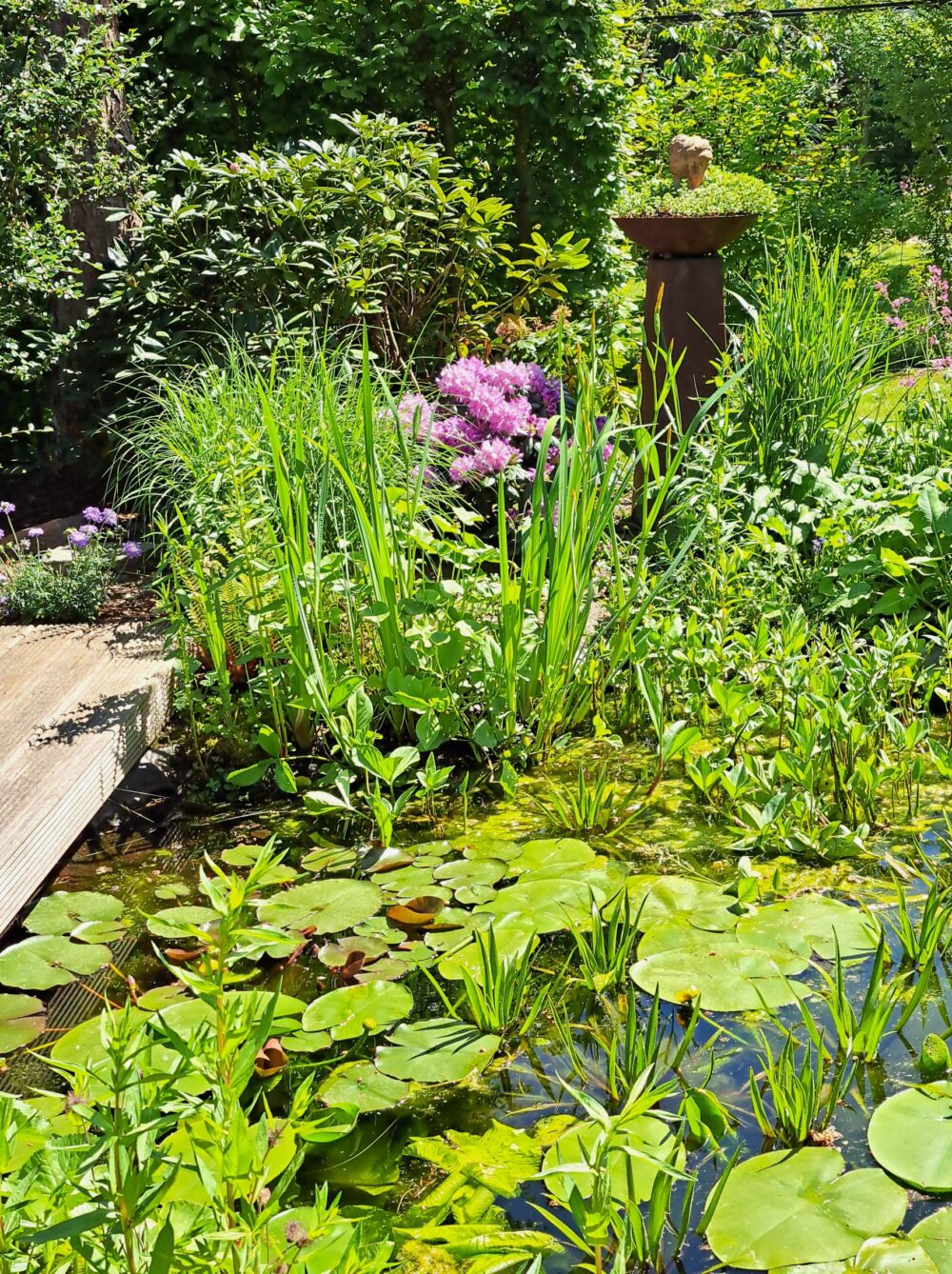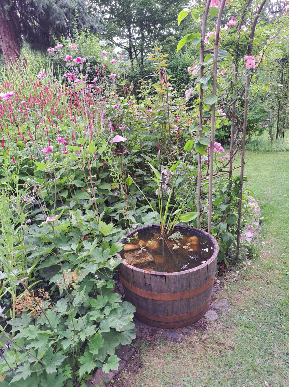 Vielfältig gestaltet mit Stauden, Rosen, Clematis, Kräutern, Teich und einigen kleinen Biotopen finden auch viele Tiere bei uns  einen Lebensraum.