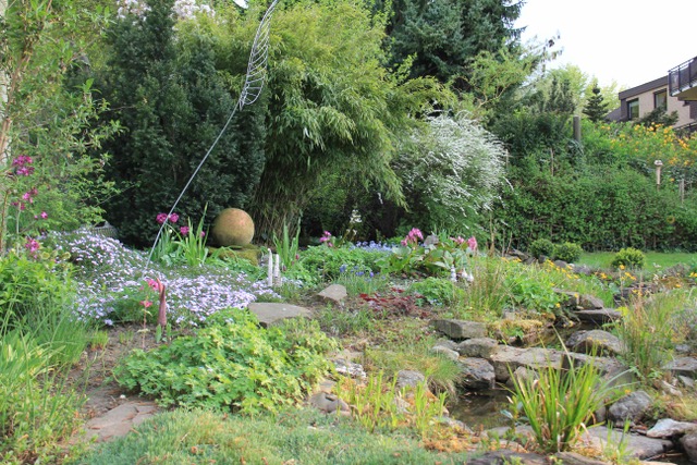 Naturnaher Garten insektenfreundlich mit Natursteinmauern, Sitzecken,  Strandkorb und Liegeplatz sowie Hochbeeten einem Gartenteich und Bachlauf.