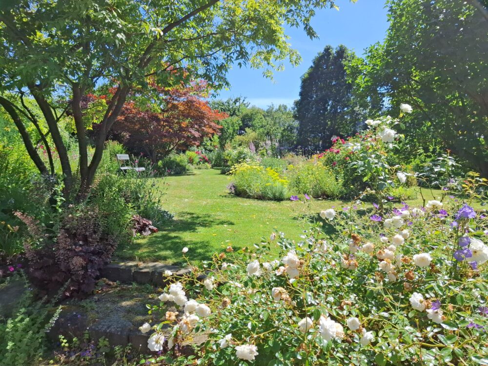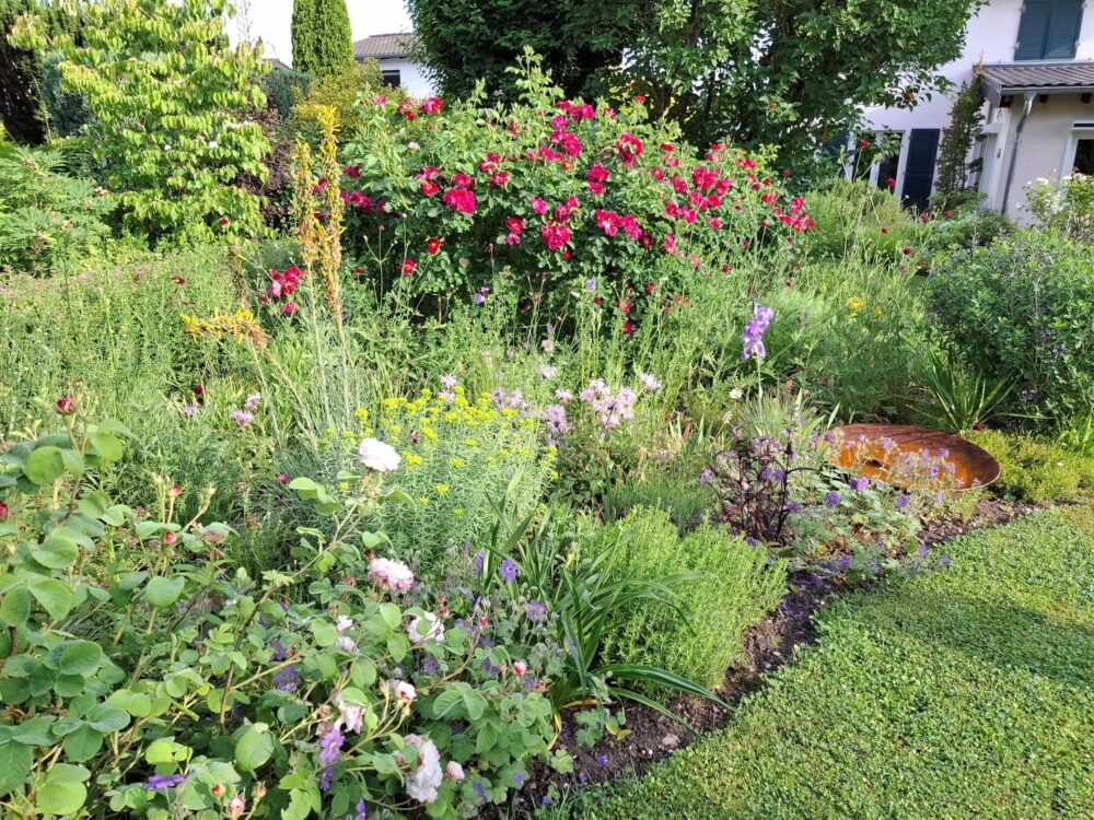 Rosen, Stauden, Blütensträucher, Naschgarten, Miniteich, Trockenmauer, Terrasse mit großem Tisch. Unterschiedliche Sitzplätze in der Sonne und im Schatten laden zum Verweilen ein und machen den Garten aus verschiedenen Perspektiven erlebbar.